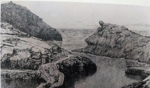 part where Knight and Stephen realize that they had both been in love with Elfride and race to reclaim her only to find that she's dead. It was my great pleasure to find that she was dead and that their love prospects had been ruined. How horrible of me.This is a picture of the area around Boscastle (disguised as Castle Boterel in the book). This drawing was the frontispiece of the 1895 edition of A Pair of Blue Eyes