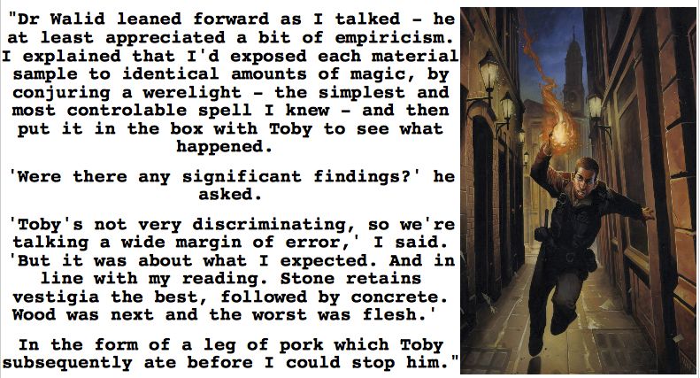 First is the very distinct narrative voice of Peter Grant - a bit snarky, a bit smartass, full of endless geeky references and quite a bit of self-deprecating humor, and so captivating that, I swear, I'd read about grocery shopping and plumbing if Peter Grant was narrating it.