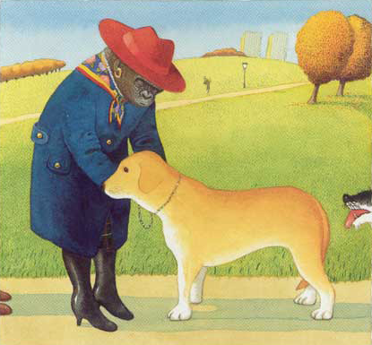 The second story is told by the man sitting by Charles' mother. He is clearly depressed, as he doesn't have a job, and has gone to the park to get out of his house with his daughter, Smudge, and their dog. Anthony Browne's pictures are amazing and they really convey how everything looks when you're depressed. The streets look bleak and sad. But after seeing the girl and the dog playing, he says he feels better and the streets look completely different.